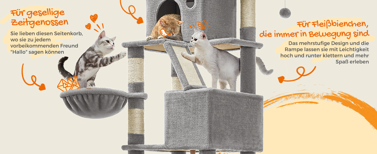- [All-in-One-Spielplatz] 2 gut gepolsterte Plattformen, 2 Kuschelhöhlen, 1 flauschiger Korb, 2 Plüschbälle und 1 Hängematte – auf diesem mehrstöckigen Kratzbaum findet jede Katze ihren Lieblingsplatz – perfekt für Mehrkatzenhaushalte