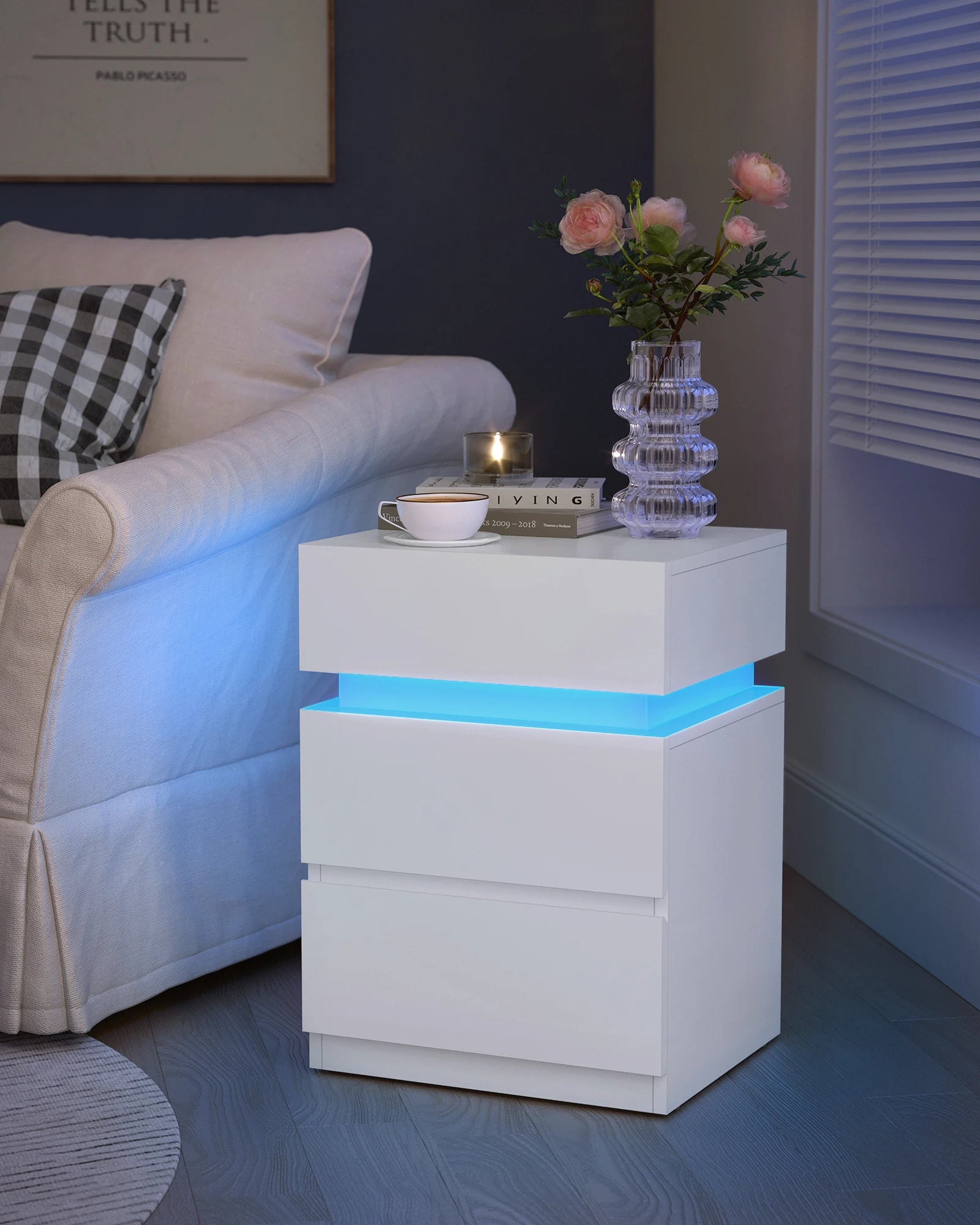 [LED-Beleuchtung mit einstellbaren Farben und Modi] 25 Farben, 6 Helligkeitsstufen, 10 Blinkmodi und 6 Blinkfrequenzen – stellen Sie die LED-Beleuchtung der Nachtkommode mit der mitgelieferten Fernbedienung ein, um verschiedene Atmosphären zu schaffen